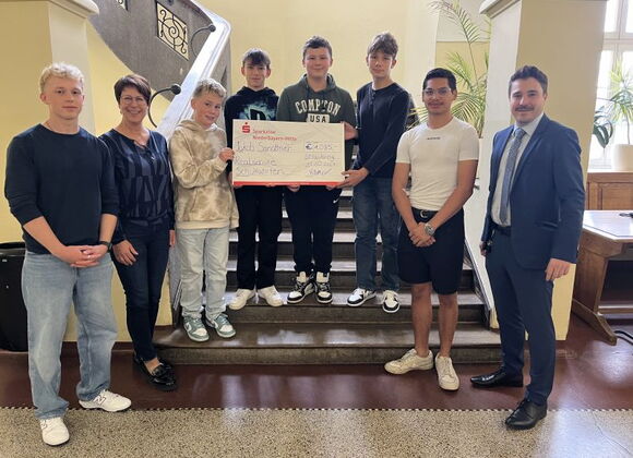 Mit großer Freude nahmen RSKin Petra Hirtreiter und Schüler die großzügige Spende von 1085 Euro der Sparkasse im Namen des Fördervereins entgegen. Sparkassenregionaldirektor Stefan Asenbaum, seines Zeichens selbst ehemaliger Sandtner-Realschüler, überbrachte selbst den Spendenscheck. Das Geld wird zweckgebunden zur Bezuschussung der Klassenfahrten genutzt.