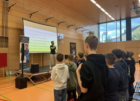 Auf Einladung des Elternbeirates durften die 8. - 10. Klassen 90 Minuten lang den Motivationscoach Raphael Gratzl erleben. Denken - Handeln - Glücklichsein ist das Motto seiner Schultour, die den Landshuter in die Schulen bringt. Mit viel Schwung und Interaktion will der junge Mann Schüler zu mehr Motivation und kreativem Denken anregen. Unsere Jungs hatten sichtlich ihren Spaß beim gegenseitigen Loben und Anfeuern.