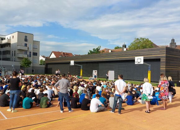 Zu Beginn des neuen Schuljahres ist es Usus, dass die Schulgemeinschaft einen gemeinsamen Gottesdienst feiert. Bislang waren dafür die katholischen und evangelischen Schüler meist in einer Kirche versammelt, während die Schüler, die keiner oder einer anderen Glaubensgemeinschaft angehören, im Schulhaus verweilten. Damit nun wirklich alle Schüler und Lehrkräfte zusammen den Start ins neue Schuljahr begehen können, planten die Religions- und Ethiklehrkräfte eine kurzweilige Einstimmung. Dieser "Startschuss" mit sehr guten Impulsen für die Gemeinschaft konnte bei schönem Wetter auf dem Sportplatz begangen werden.
