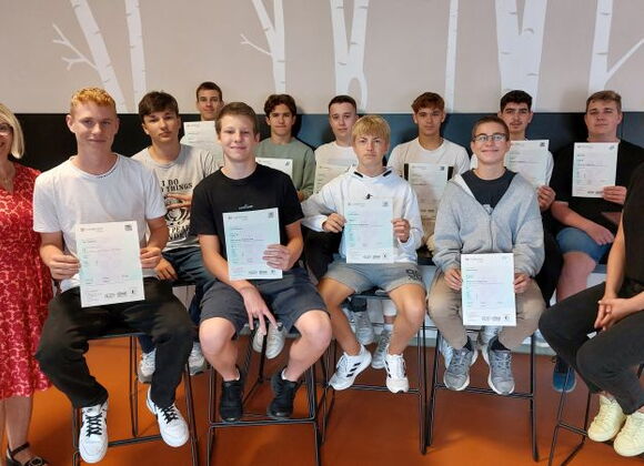 Stolz halten die Teilnehmer des Preliminary English Tests (PET) ihre Zertifikate des Cambridge Instituts in die Kamera. Im Mai nahmen einige Schüler der 9. Klassen freiwillig an dieser Prüfung teil, die aus einem mündlichen und einem schriftlichen Prüfungsteil besteht. Sie stellten sich der ungewohnten Herausforderung und bewiesen, dass ihre Englischkenntnisse in den Bereichen Speaking, Listening, Reading und Writing dem Niveau B1 des CEFR entsprechen. Wir gratulieren herzlich zu dieser tollen Leistung!