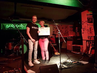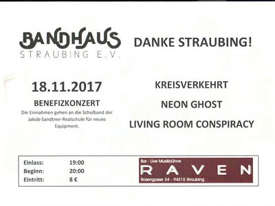 Es war ein großartiges Konzert, das der Bandhaus-Verein im Musiklokal Raven, Straubing, organisiert hatte. Die drei Bands Living Room Conspiracy, Neon Ghost und Kreisverkehrt präsentierten ihre Highlights aus ihrem Musikprogramm und so wurde der Abend zu einem abwechslungsreichen Konzert, das von Coversongs über Indie-Pop zu Rock-Funk reichte. Dank der zahlreichen Gäste konnte Florian Schwarzfischer als Vorsitzender des Bandhauses einen Scheck in Höhe von 1000 Euro an die Schulleiterin Regina Houben überreichen, die das Geld gerne der Schulband für die Anschaffung eines neuen Mischpultes zur Verfügung stellen möchte. Sie bedankte sich beim Bandhaus für die tolle Idee, bei Fred Dick für die Unterstützung und schließlich beim Publikum für ihr Erscheinen. Das Bandhaus Straubing hat sich mit diesem Benefizkonzert sehr wohltätig gezeigt und in die Herzen Straubings gespielt.