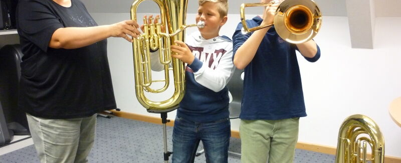 Unter Anleitung der Instrumentallehrer durfte jedes Kind in die Klarinette, das Saxophon, die Trompete, in die Posaune, das Euphonium und die Tuba hineinblasen sowie auf dem Schlagzeug seine rhythmischen Fertigkeiten testen. Die Eltern waren erstaunt ob der Vielfalt und Möglichkeiten, Töne zu erzeugen. Auf einem „Wunschzettel“ durften die Jungen ihren Instrumentenfavoriten neben zwei anderen Wünschen notieren. „Ihr habe, wie im Märchen, drei Wünsche frei“, sagte Fachbetreuerin und Bläserklassenleiterin Andrea Dietlmeier. Aber wie in einer Fußballmannschaft auch, müssen alle Positionen im Orchester besetzt werden, damit es gut klingt.