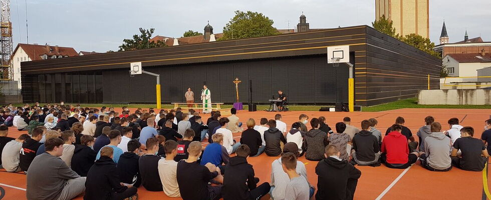 Die Fachschaften Religion und Musik hatten eine Andacht vorbereitet, die Pater Philipp in seiner bekannt charmanten Art und Weise zusammen mit Frau Bulling und Frau Dietlmeier gestaltete. Herr Haslingers musikalische Untermalung war dabei der perfekte Rahmen. Weil ein Aufenthalt in der Kirche für viele von uns immer noch unter Corona nicht infrage kommt, hielten wir die Andachten zweimal hintereinander auf dem Sportplatz. Hier war es nicht weniger andächtig und es konnten alle Schüler - egal welcher Konfession - teilhaben. Wunderbar!