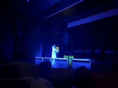 Am Vormittag des Theaterfestivals der niederbayerischen Realschulen führte Sprechdozent Adrian Stuhlfelner von der Athanor Akademie für darstellende Kunst Passau mit der Klasse 8 A einen Workshop zum Thema "chorisches Sprechen" durch, bei dem die Schüler unter anderem mehrere Impulsübungen machten.