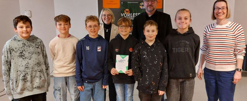 Am Ende wertete die Jury bestehend aus den Deutschlehrkräften der 6. Klassen (Frau Dahlems, Frau Haimerl und Frau Keller) sowie unserer Schulleiterin Frau Houben und dem Elternbeiratsvorsitzenden Herrn Walkshäusl, die Ergebnisse aus. Als Schulsieger ging eindeutig Johannes Kräh aus der Klasse 6 C hervor, der von der Schulleiterin die Siegerurkunde entgegennahm und aus den Händen von Herrn Walkshäusl den Hauptpreis erhielt. Auch alle weiteren Leser freuten sich über entsprechende Urkunden und Buchgutscheine.