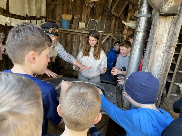 Beim Besuch der Entdeckerwelt „Flederwisch“ durften die Schülerinnen und Schüler dann selbst aktiv werden: Sie probierten sich im Papierschöpfen, erlebten die kraftvolle Dampfmaschine in Aktion und unterstützten sogar den Schmied bei seiner Arbeit.