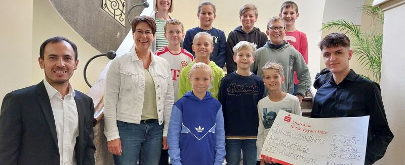 Der ehemalige Schüler Florian Avdyli überbrachte zusammen mit Alexander Gebert von der Sparkasse Niederbayern-Mitte den Spendenscheck. Sie informierten sich über die abwechslungsreichen Unterrichtstage und die Fünftklässler berichteten bereitwillig von ihren Erlebnissen.