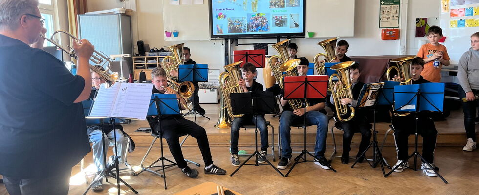 Im Musiksaal erwartete die jungen Besucher eine Instrumententheke zum Ausprobieren der Blechblasinstrumente. Die Bläsergruppe spielte halbstündlich ein kleines Ständchen und die Schulband zeigte ihr Können in der offenen Bandprobe. Weiter ging es zu den EDV-Räumen. Bei verschieden Aktionen, wie „Zeichnen am Smartboard gegen die künstliche Intelligenz“ oder „Bist du ein IT-Champion? - Ein Wer-wird-Millionär-Quiz am Smartboard“ konnten sich die Besucher weitere Stempel verdienen. „Vom Holzbaustein zur digitalen CAD-Zeichnung“ hieß eine Kreation von spontan gebauten Werkstücken mit Solid Edge von Schülern der 10. Jahrgangsstufe.