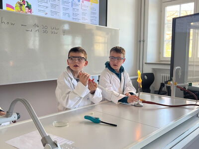 Die Schüler des Wahlfachs „Kleine Professoren“ führten eine beeindruckende Chemieshow vor. Mit Lichteffekten, Farbspielen und der Herstellung von „Goldmünzen" begeisterten sie die Mädchen und Jungen auf besondere Weise. Eine weitere Experimentierwelt und Mitmach-Aktionen boten die Fachschaften Chemie und Physik. Passend dazu präsentierte sich die MINT-Gruppe unter dem Motto „Wir fördern deine Stärken“.