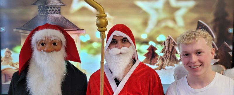 Passend zum Nikolaustag besuchte der SMV-Nikolaus mit seinem "Engel" die drei 5. Klassen. Er verlas eine kleine Rede, die jeweils die Klassenleitungen speziell für ihre Klasse vorbereitet hatten. Nachdem der Krampus mit seiner Kette ein bisschen gerasselt hatte, erhielten nicht nur die braven Schüler einen Schokonikolaus und eine Mandarine.